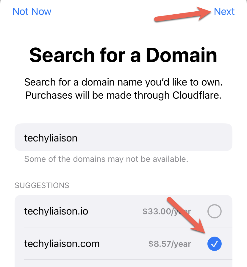 The available options, along with their price, will appear. Select the domain you want by tapping the radio button on its right. Then tap on ‘Next’ in the upper-right corner of the screen.