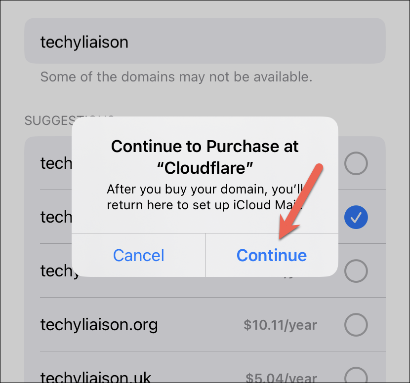 A prompt will appear asking you to continue to Cloudflare to buy the domain, tap ‘Continue’.