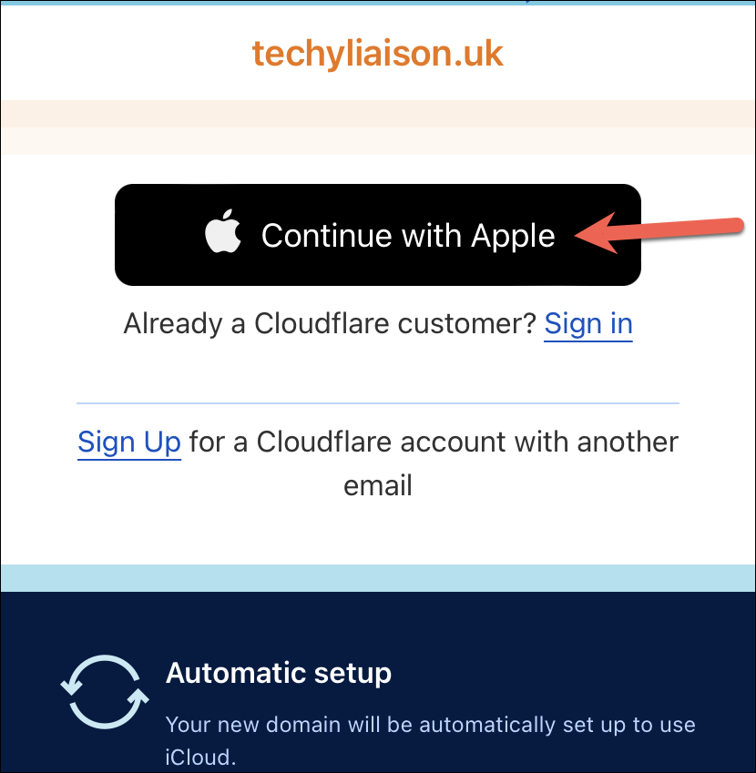 If you have an account on Cloudflare, sign in to your account. Otherwise, you can use your Apple ID for a quick sign-up. Tap ‘Continue with Apple’ and authenticate with Face ID, Touch ID, or your Apple ID password to sign in.