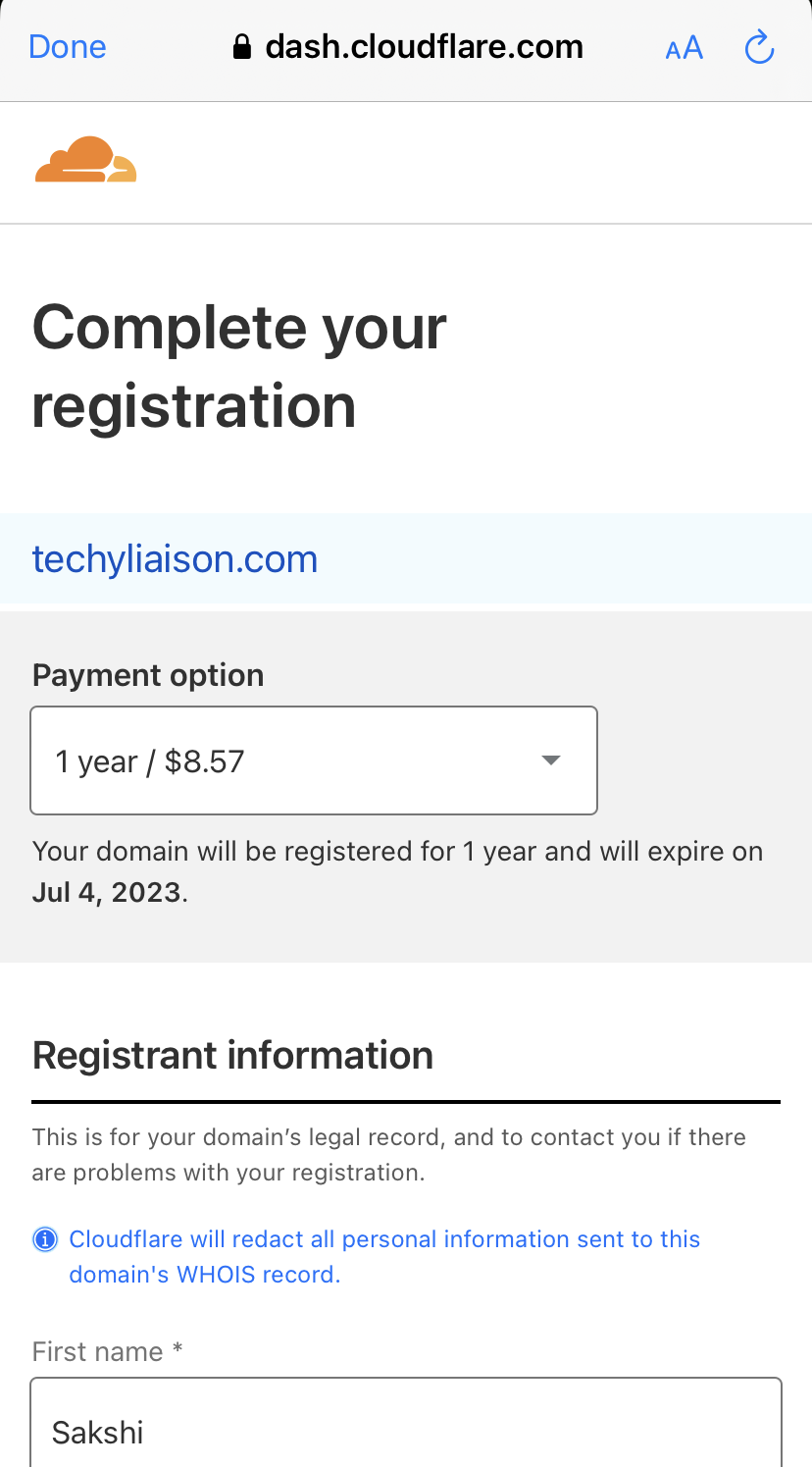 Once you sign in, Cloudflare’s dashboard will open where you can complete the registration details, like your name, email address, address, etc. You can also select the registration period for the domain; by default, it will only be for a year but you can choose longer. You can also choose whether you want to auto-renew the domain after the current registration period expires.