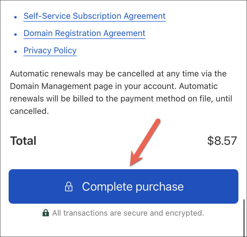 Then complete the payment using either a credit/ debit card or PayPal. Tap ‘Complete Purchase’ or ‘Complete with PayPal’ to buy the domain once you fill in all the registration details.