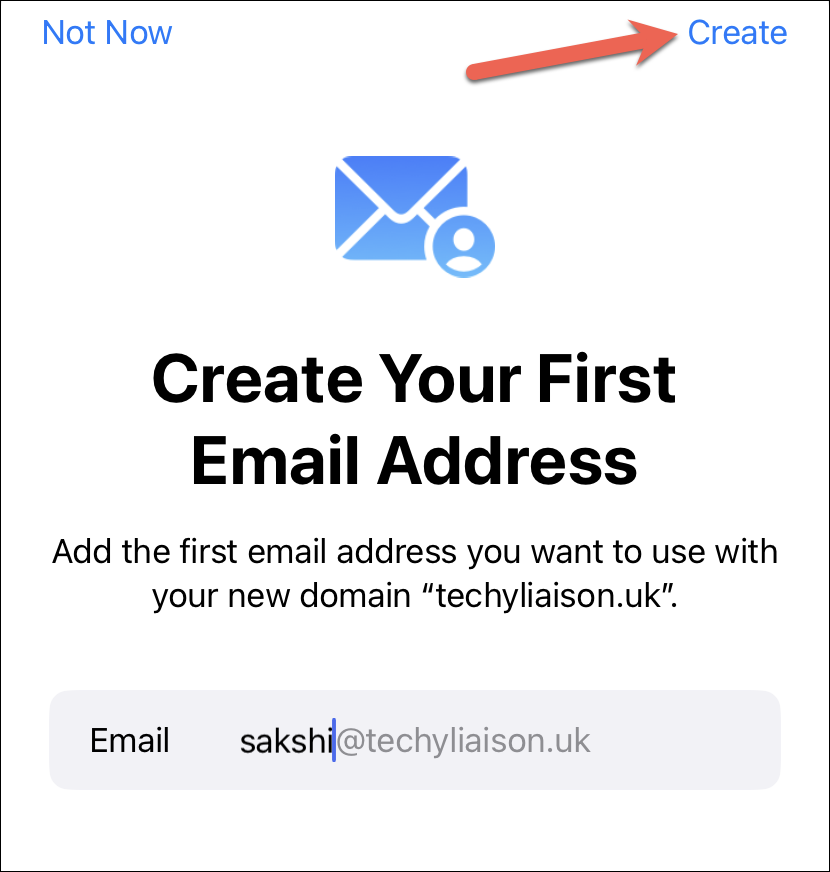 And that’s it. You’ll be able to create your first custom email address for the domain. Simply enter the username for the email address and tap ‘Create’ in the upper-right corner.