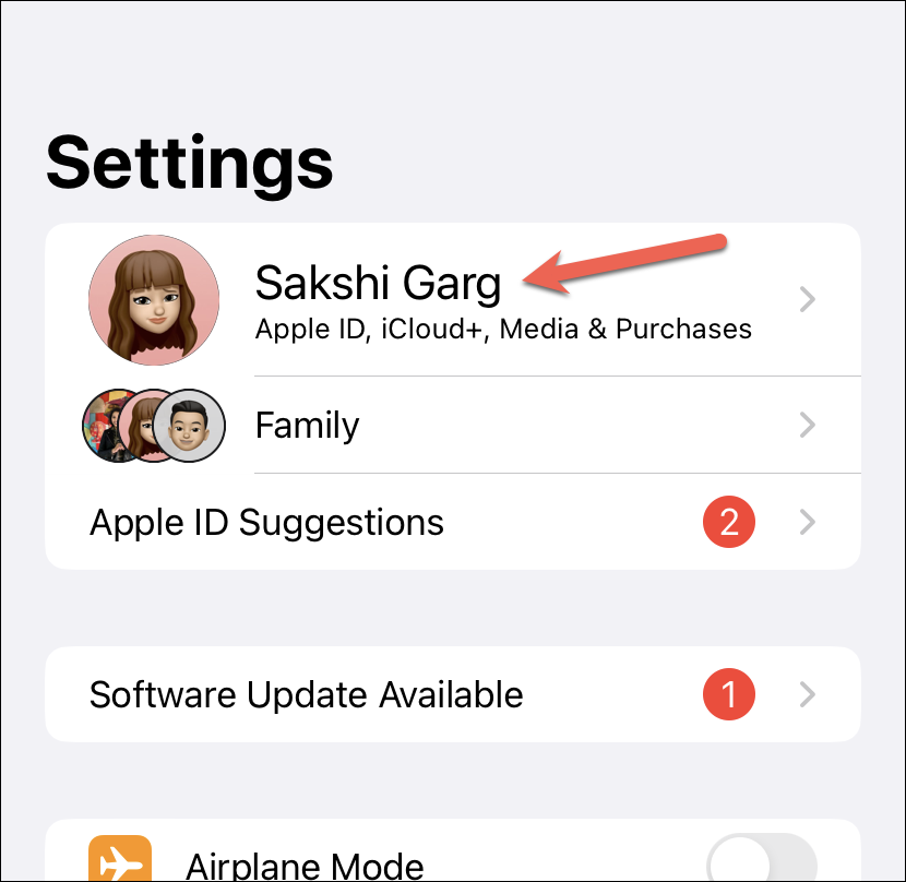 Open the Settings app on your iPhone and tap your name at the top.