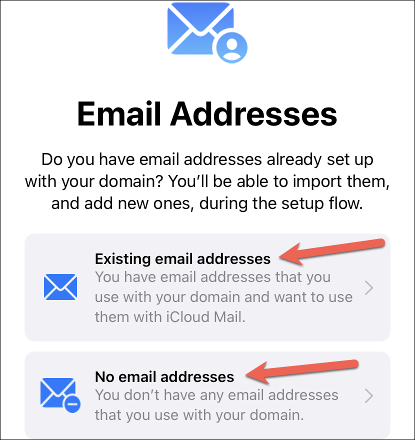 Now, if you have existing email addresses on your domain, tap the option for ‘Existing email addresses’ so you can configure them to use with iCloud Mail. Otherwise, tap ‘No email addresses’ to proceed.