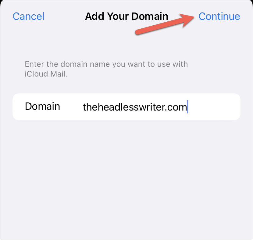 Then, enter the domain you want to use with iCloud Mail and tap on ‘Continue’.
