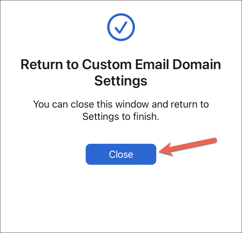 Tap ‘Close’ to return to the Settings screen and finish the setup. It only takes a few minutes for your domain to be connected to iCloud Mail, but sometimes it can take up to 24 hours.