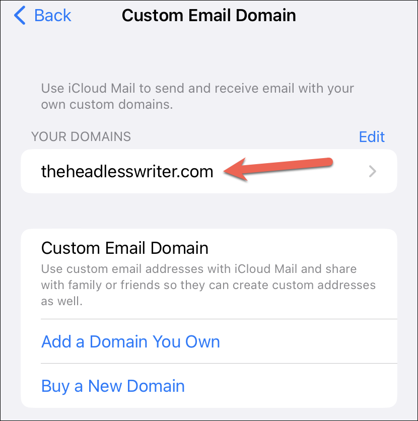 If you had to wait for the DNS settings to update, navigate to the Custom Email Domain settings and tap your domain name under the ‘Your Domains’ category.