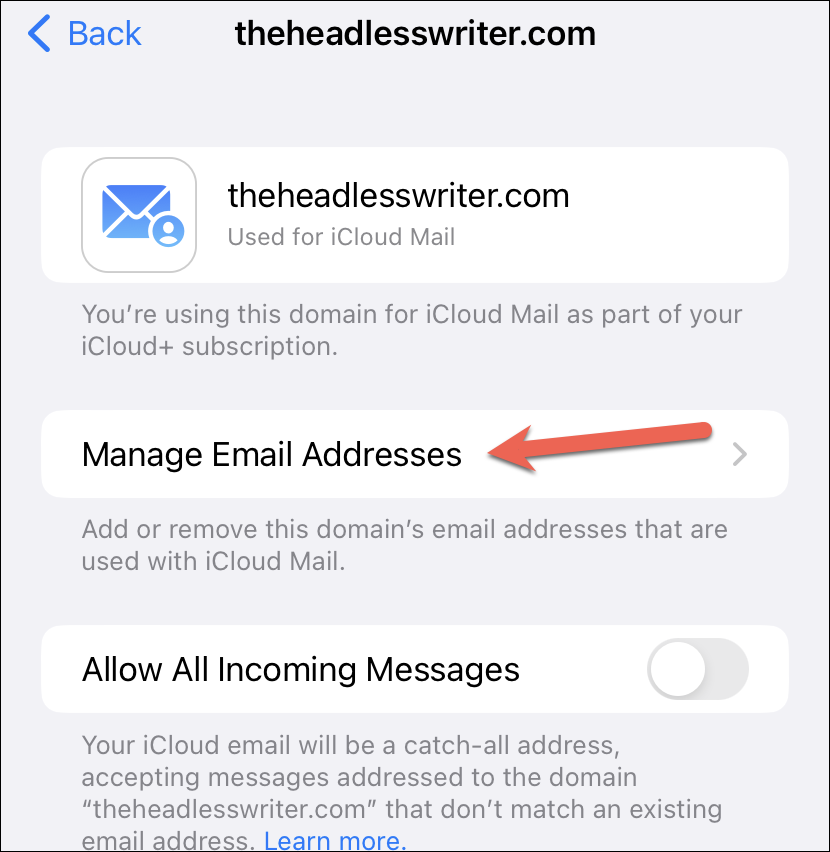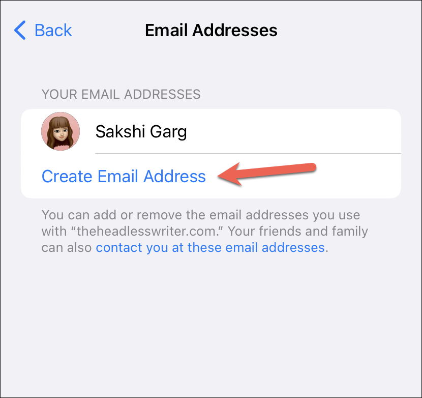 Now that your custom email domain is all set up, you can finally create your custom email address. Whether you used iCloud to buy a domain or you used a domain you owned, these steps to create a custom email address are the same for both. Even if you previously added an email address, you can use these steps to create another custom email address.