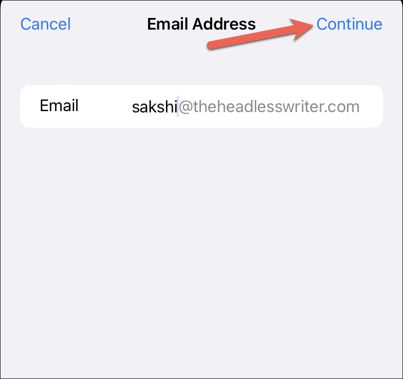 Enter the name for the email address. It can be anything you want, like your name or something else. Then, tap ‘Continue’ in the top-right corner of the screen.