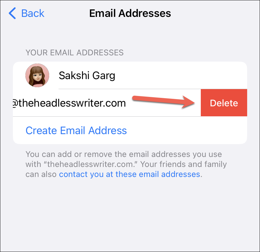 To delete an email address, simply swipe left on the email address and tap the ‘Delete’ option that appears.