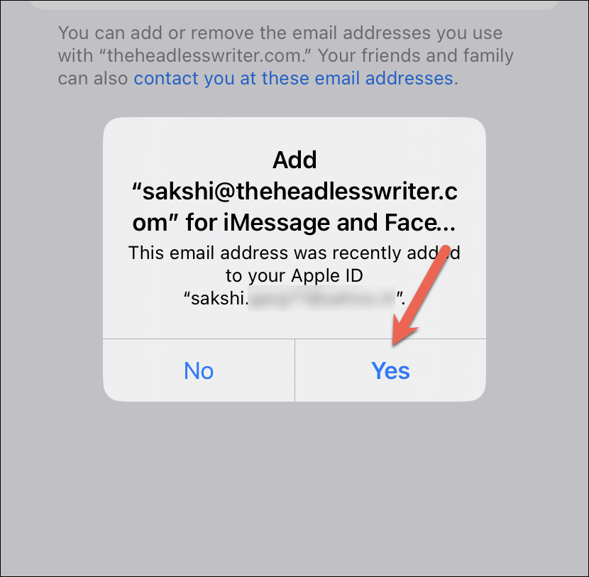 You can even use these custom email addresses with FaceTime and iMessage across your Apple devices. A prompt asking you to add the custom email address for FaceTime and iMessage will appear almost as soon as you create the address. Tap ‘Yes’ from the prompt to confirm.