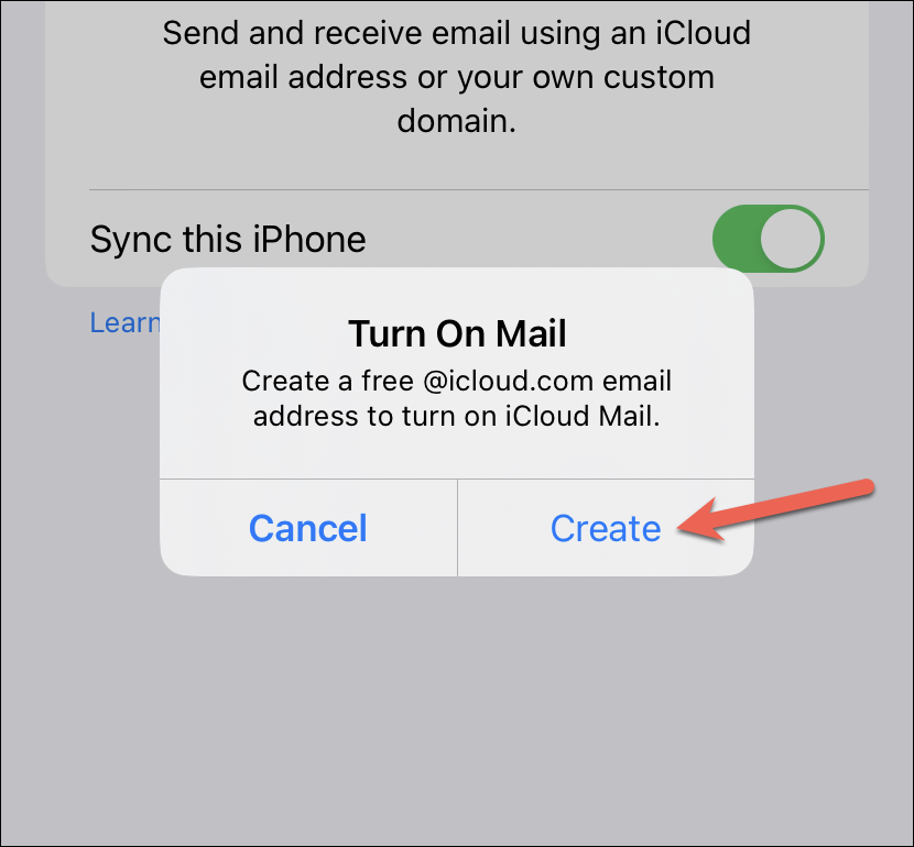 A prompt will appear on your screen instructing you to create an @icloud.com email address to enable this option. Tap on ‘Create’ to continue.