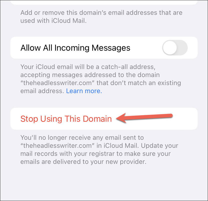 To stop removing the custom domain with iCloud Mail, navigate to custom email domain settings again.