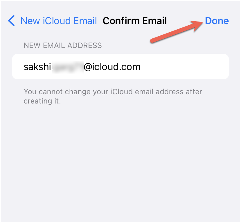 Confirm your email address and tap ‘Done’ in the upper-right corner to create an @icloud.com email address and turn on iCloud Mail.