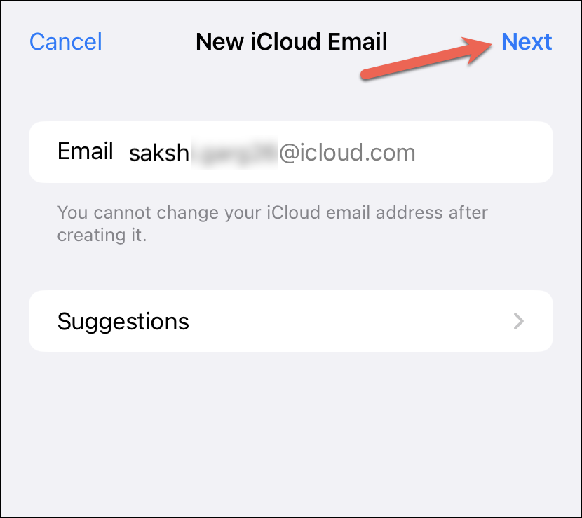 Then, enter the username for the account and tap ‘Next’. You cannot change this iCloud email address once you create it, so choose the name accordingly. If the address you chose is not available, try another or use one from Apple’s suggestions.