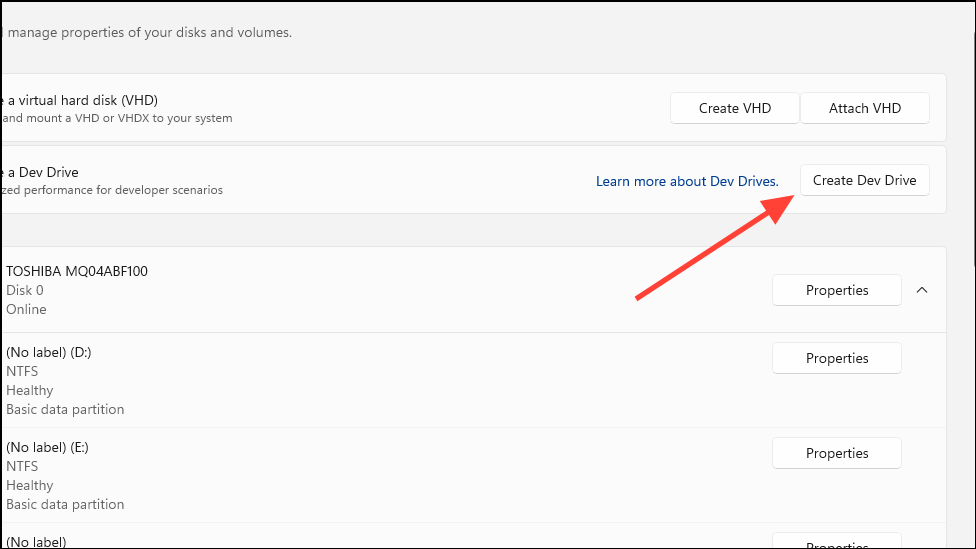 Step 5: Click on the Create Dev Drive button to start the setup process.
