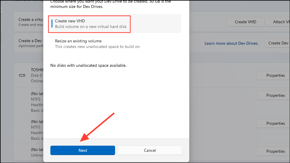 You can create a Dev Drive either by using a virtual hard disk (VHD) or by resizing an existing partition. Below are the detailed steps for both methods.