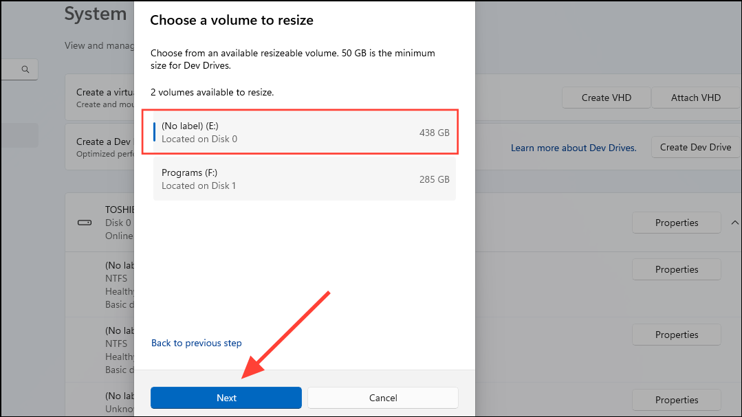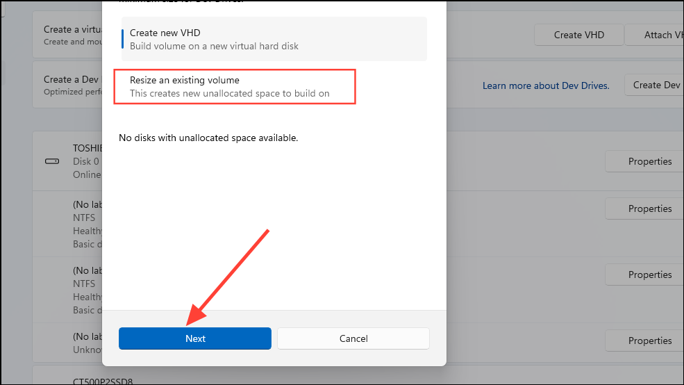 Step 1: In the Create a Dev Drive setup, select the Resize an existing volume option and click Next.