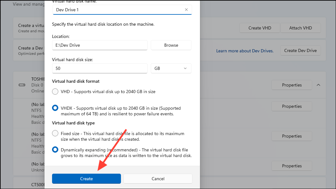 Step 7: Enter the details for your Dev Drive, such as the name, location, and size. You can select either a fixed size or a dynamically expanding size. After filling in the information, click on Create.