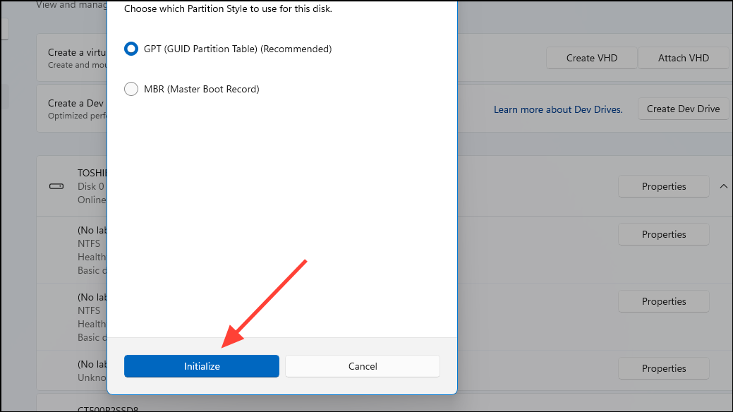 Step 9: Once the VHD is created, select the partition style. The default option is GPT (GUID Partition Table), which is recommended for most systems. Click on Initialize.