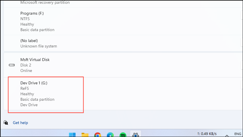 Step 11: Your Dev Drive is now ready to use. You can verify its creation by scrolling down the Disks & volumes page, where it will be listed among your other drives.
