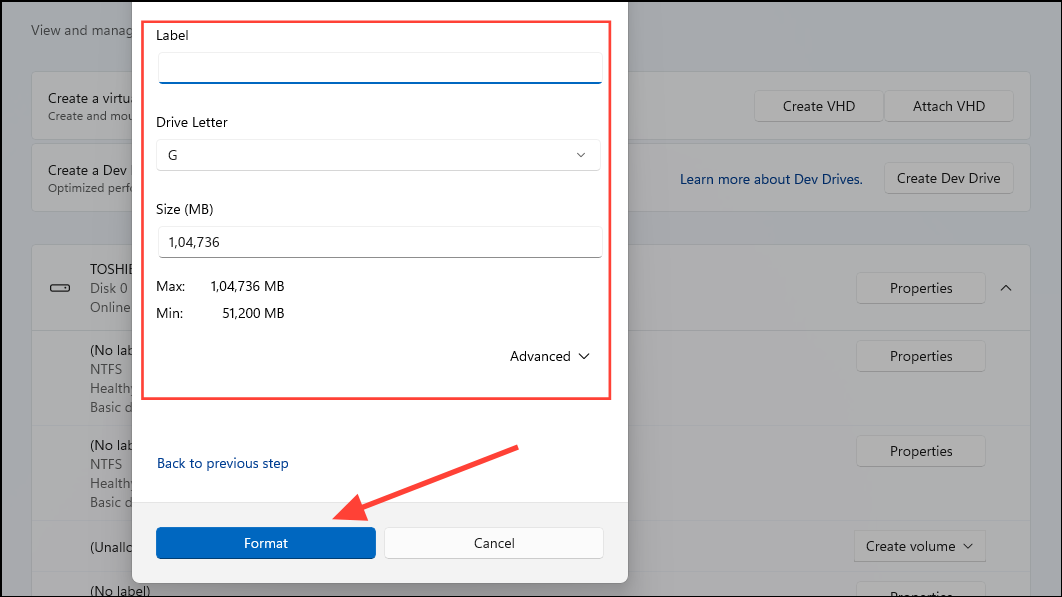 Step 10: Assign a label to your Dev Drive, choose a drive letter if desired, and then click on Format to complete the setup.