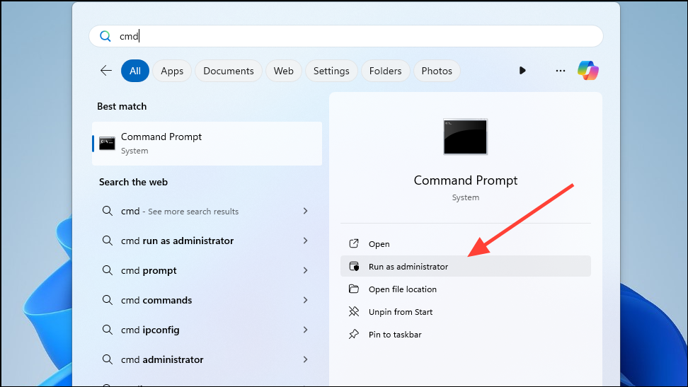 Step 1: Open the Start menu, type cmd, and select Run as administrator to launch an elevated Command Prompt.