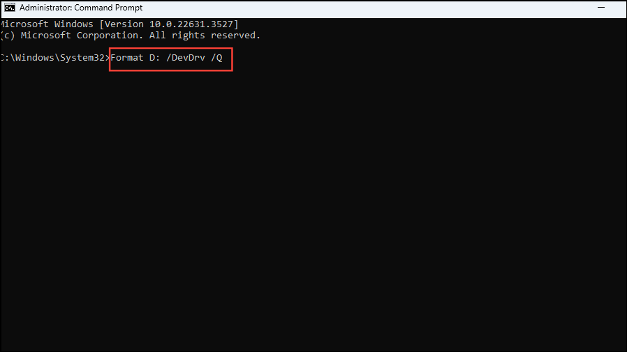 Step 2: In the Command Prompt window, type format D: /devdrv /q and press Enter. Replace D with the drive letter you intend to format as a Dev Drive.