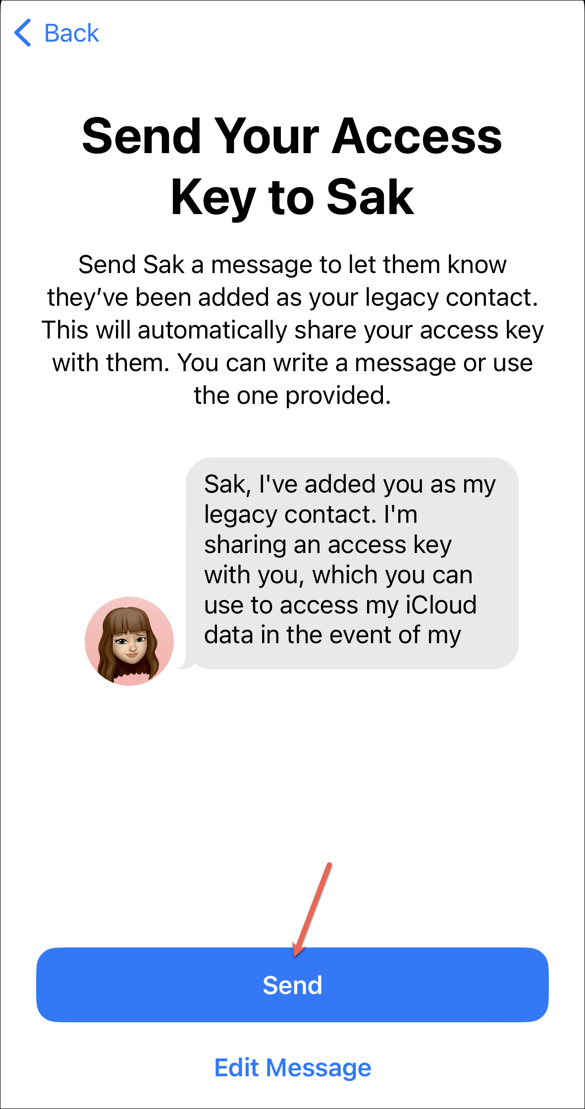 Tap the ‘Send Access Key’ option. Then, tap ‘Send’ on the message; you can also edit the message before sending it.