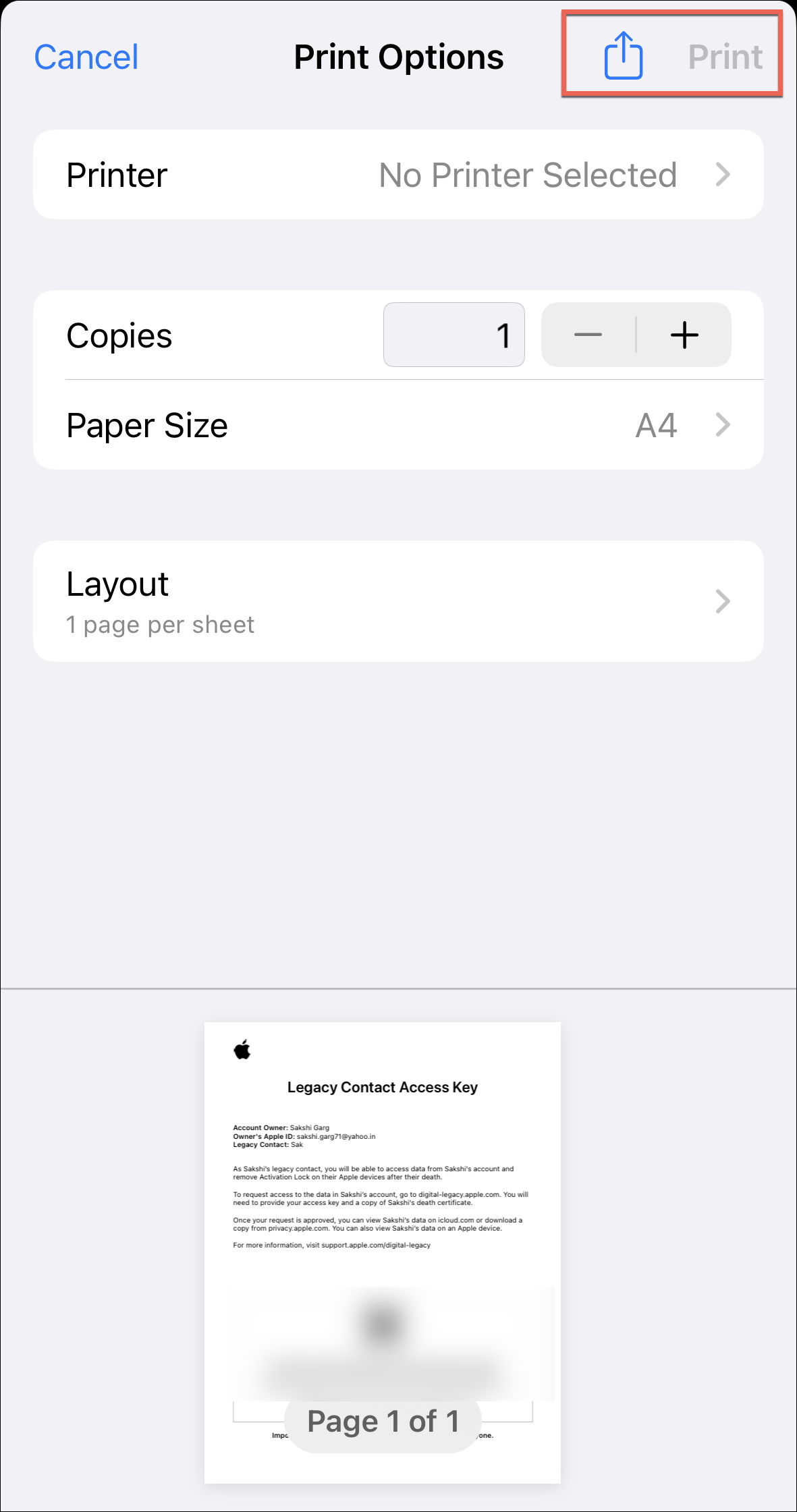 Tap on the ‘Print the Access Key’ option. Then, either tap the ‘Print’ option directly. Or, tap the ‘Share’ option and save the PDF to your files or share it using other sharing options available.