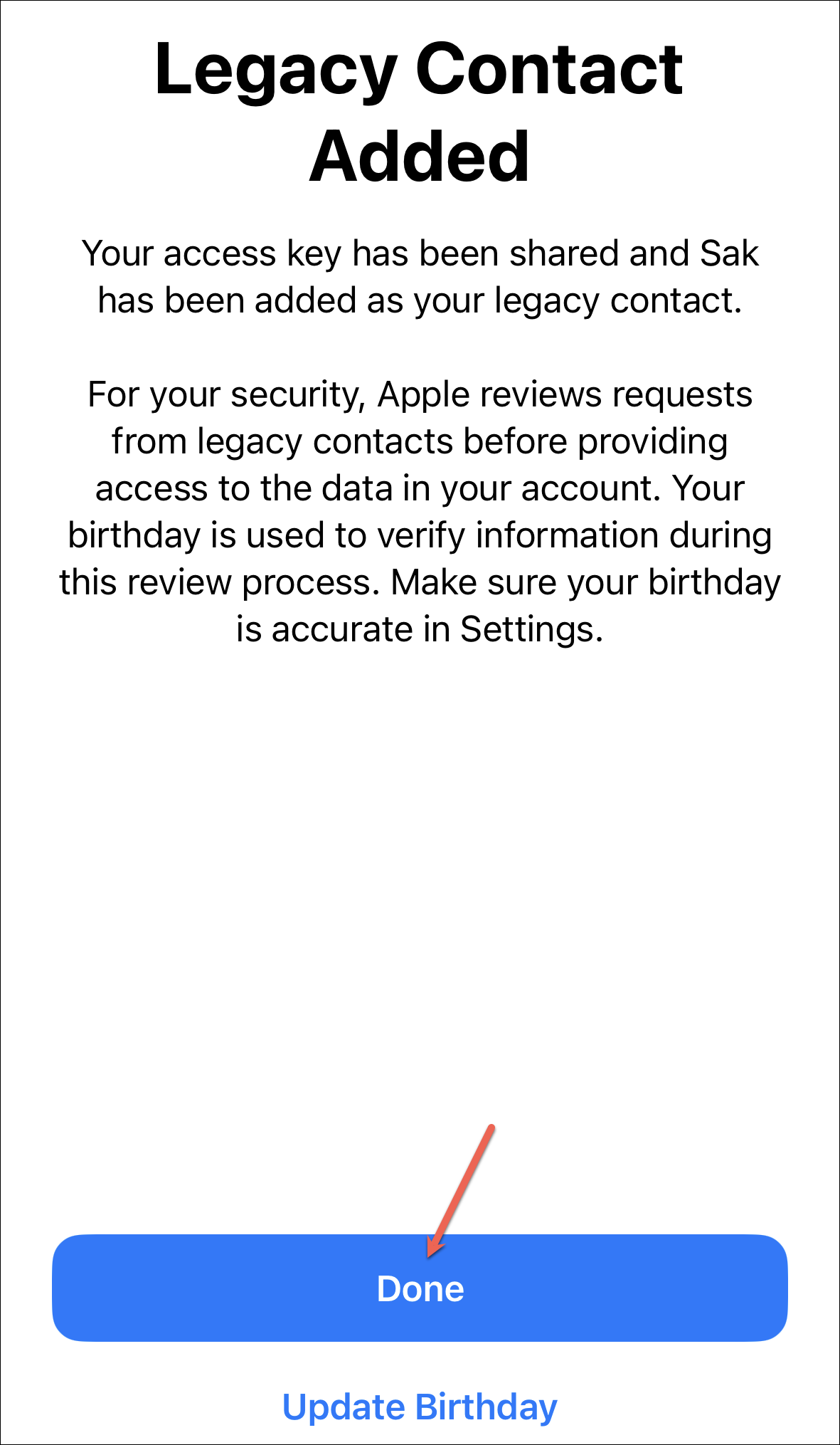 And that’s it. Your legacy contact is set up. Your birthday is also used in the verification process. If you’re sure you have the correct information in your Apple ID settings, then tap ‘Done’ to close the setup screen. Otherwise, tap ‘Update Birthday’ to go to the menu to update your birthday.