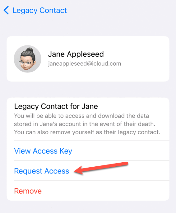 Then, tap the name of the person for whom you want to request access. Further, tap the ‘Request Access’ option. Since the access key is automatically stored, in this case you would need to upload the death certificate only.