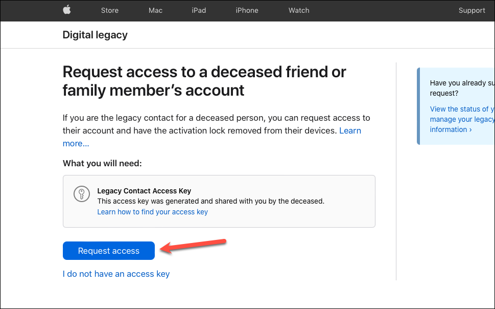 To request access from the web, go to Apple’s Digital Legacy site. Then, click the ‘Request Access’ option. Then, you’ll need to verify your identity and provide the access key and the death certificate to request access.
