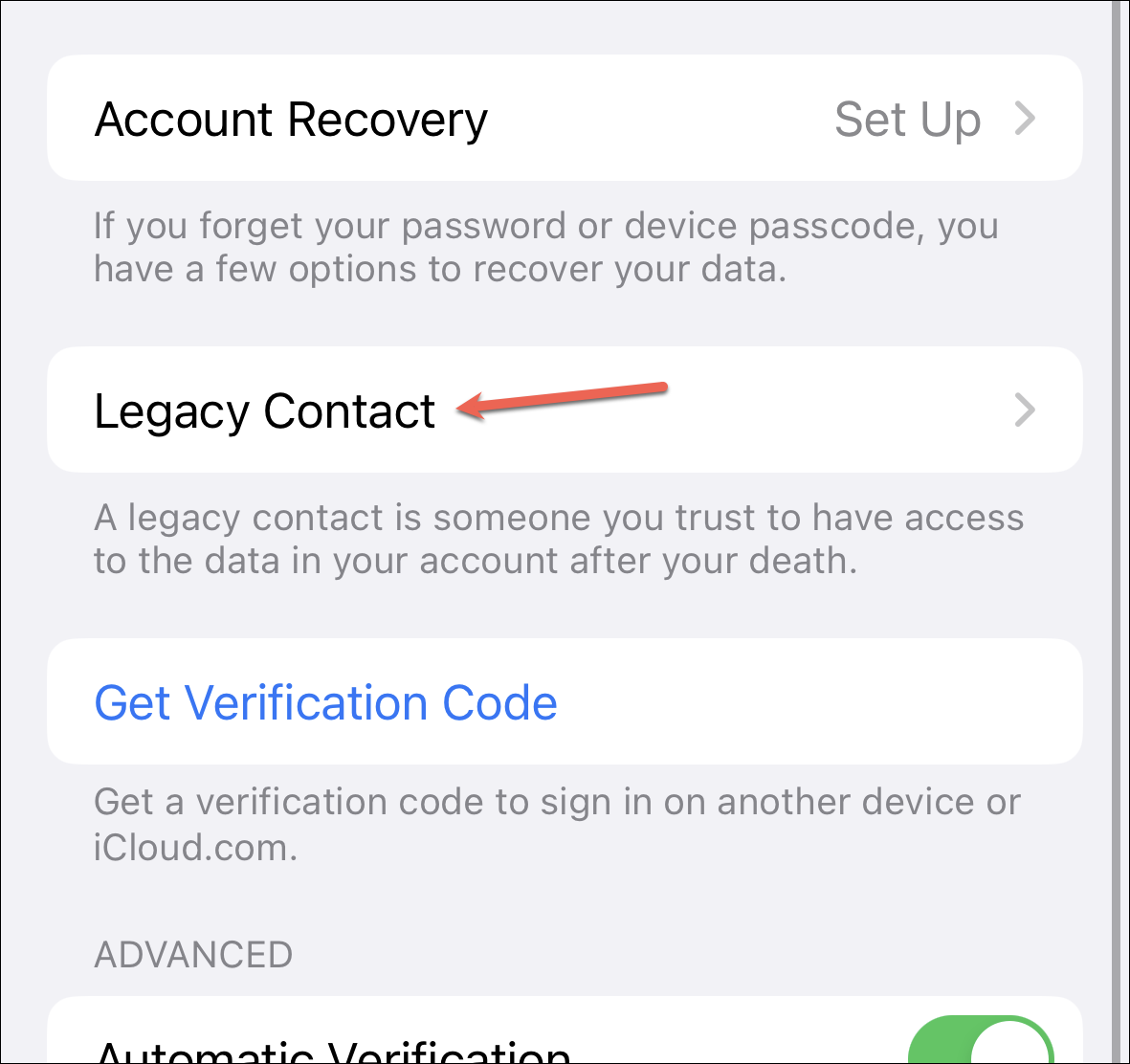 Now, tap the option for ‘Legacy Contact’.