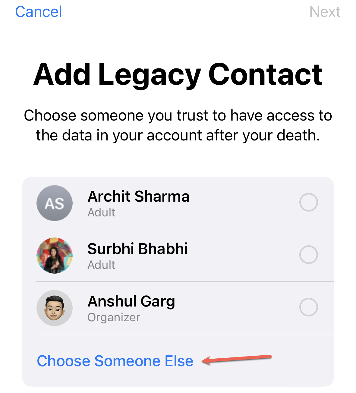 Then, if you’re in a family sharing group, the members in the group will appear for easy access. If you want to add someone from the group, tap their name. Otherwise, tap ‘Choose Someone Else’.