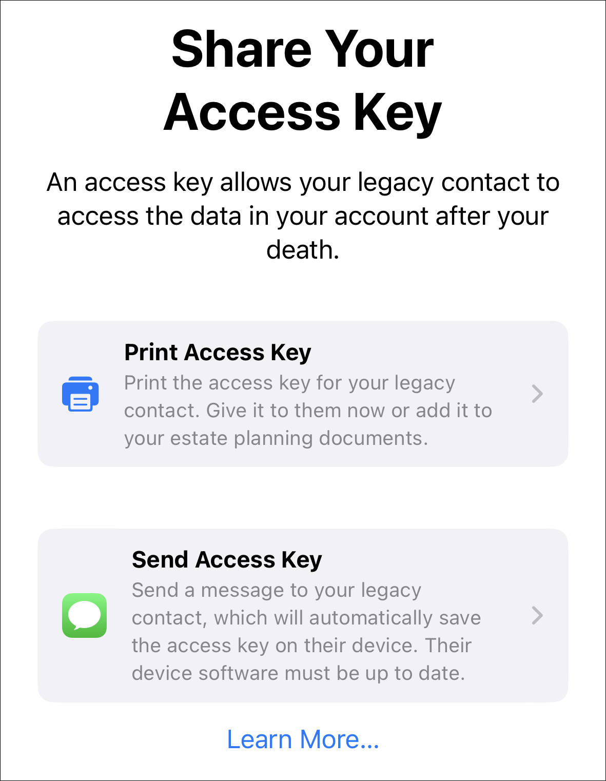 Even if you send the key using messages, you can still print it from the legacy contact settings to keep a copy with yourself or your estate planning documents for safekeeping.