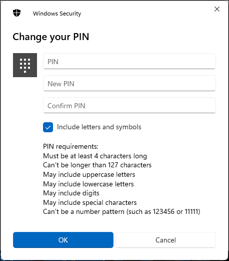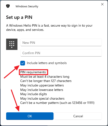 - If you want to include letters and symbols in your PIN, check the box next to Include letters and symbols.