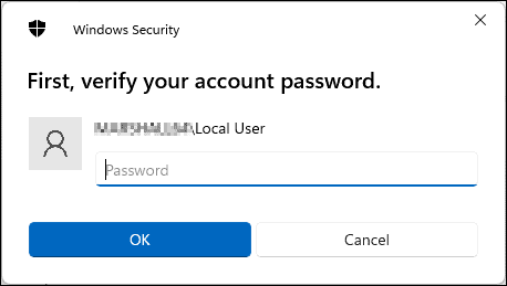 - A Windows Security window will prompt you to verify your identity. Enter your Microsoft account password and click OK.