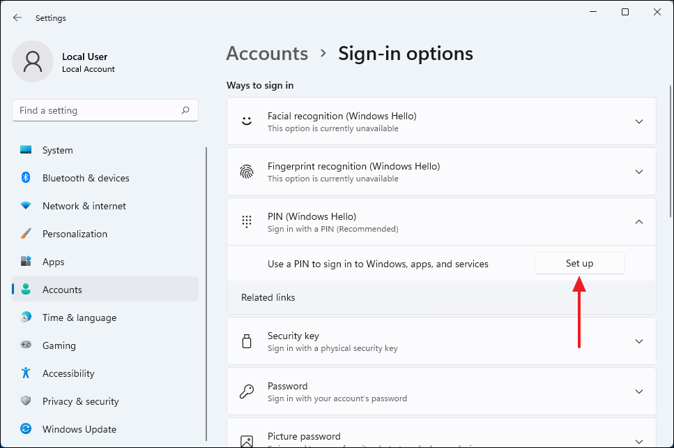 - Under the Ways to sign in section, find PIN (Windows Hello) and click on Set up.
