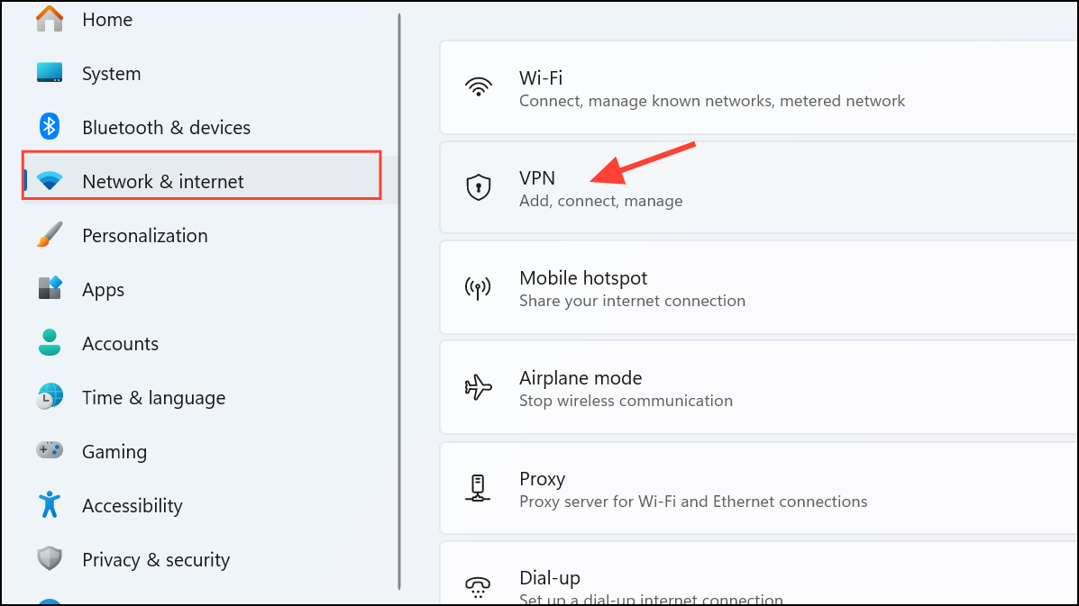 Step 1: Open the Windows 11 Settings app by pressing Windows key + I. In the left pane, select "Network & internet," then click on "VPN" in the right pane.