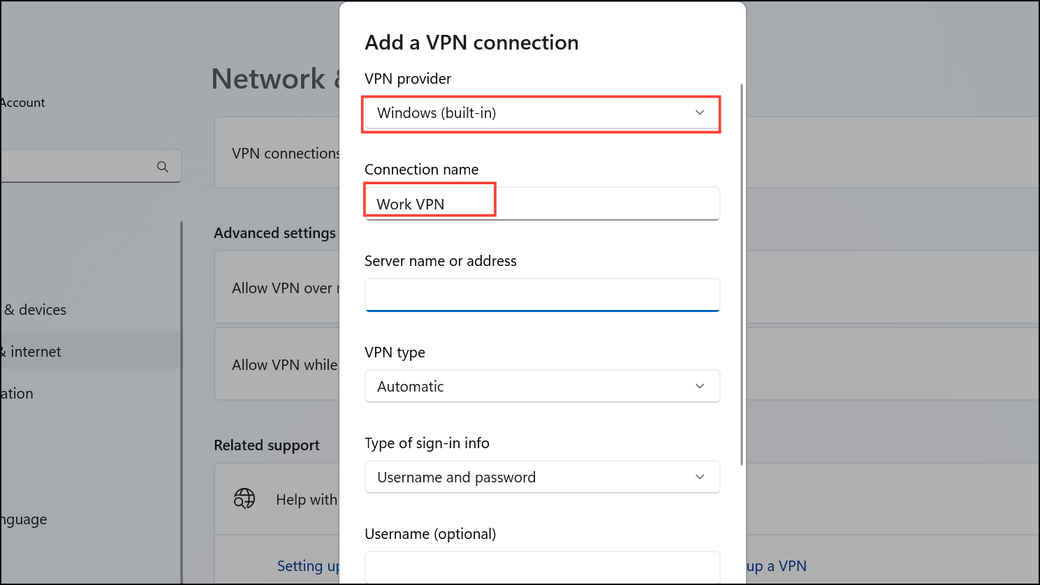 Step 3: In the "VPN provider" dropdown, select "Windows (built-in)." Under "Connection name," enter a recognizable name for your VPN connection (e.g., "Work VPN"). Enter the VPN server's address provided by your VPN service or network administrator in the "Server name or address" field.