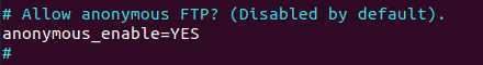 sudo vim /etc/vsftpd.confTo allow anonymous users to access the FTP server, locate the line anonymous_enable=NO and change it to anonymous_enable=YES. This change permits users to connect without providing a username and password.