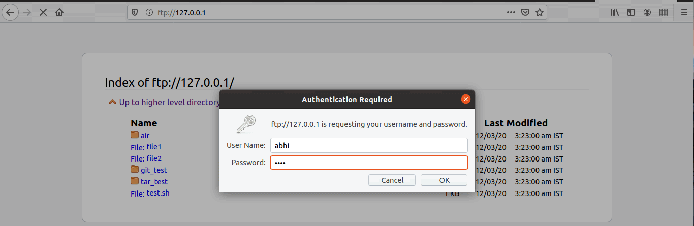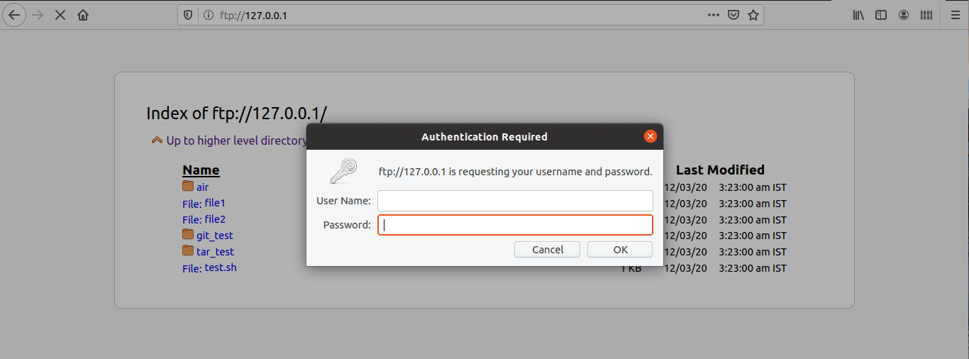 sudo service vsftpd restartWhen you access the FTP server in your browser now, you'll be prompted to enter a username and password.