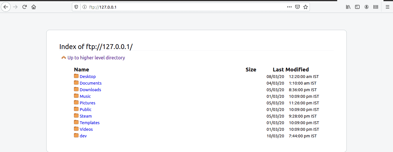 This address directs the browser to connect to the FTP server running on the local machine (localhost). If you're testing from a different machine on the same network, replace 127.0.0.1 with the FTP server's IP address.