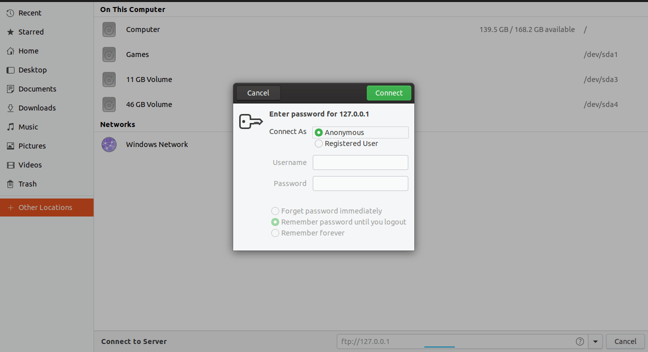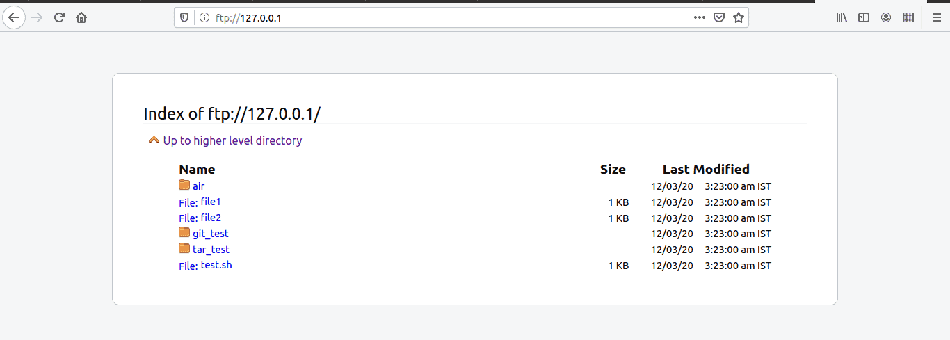 To test uploading files to the FTP server, you'll need to use an FTP client that supports file transfers. On Ubuntu, the default file manager, Nautilus, can function as an FTP client.