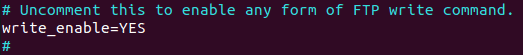 To allow authenticated users to upload files to the FTP server, you need to enable write permissions. In the /etc/vsftpd.conf file, find the line #write_enable=YES and uncomment it by removing the # symbol at the beginning of the line. The line should now read: