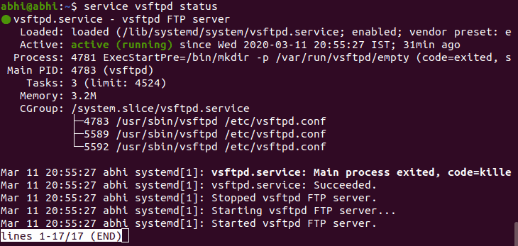 Once the installation is complete, the vsftpd daemon should start automatically. To verify that it's running correctly, execute: