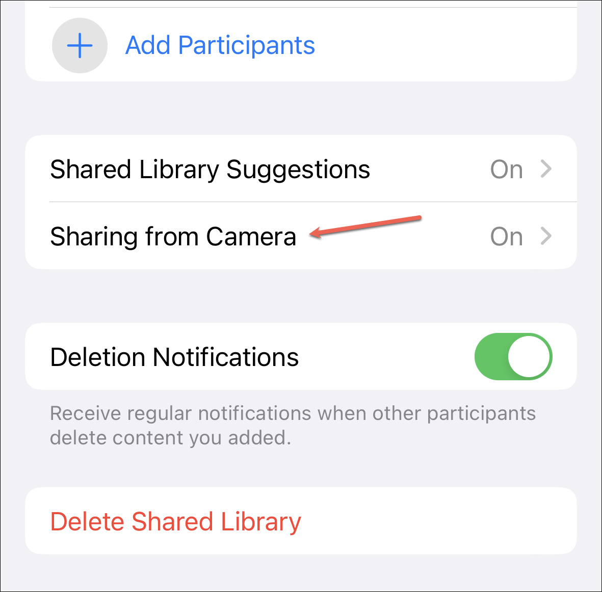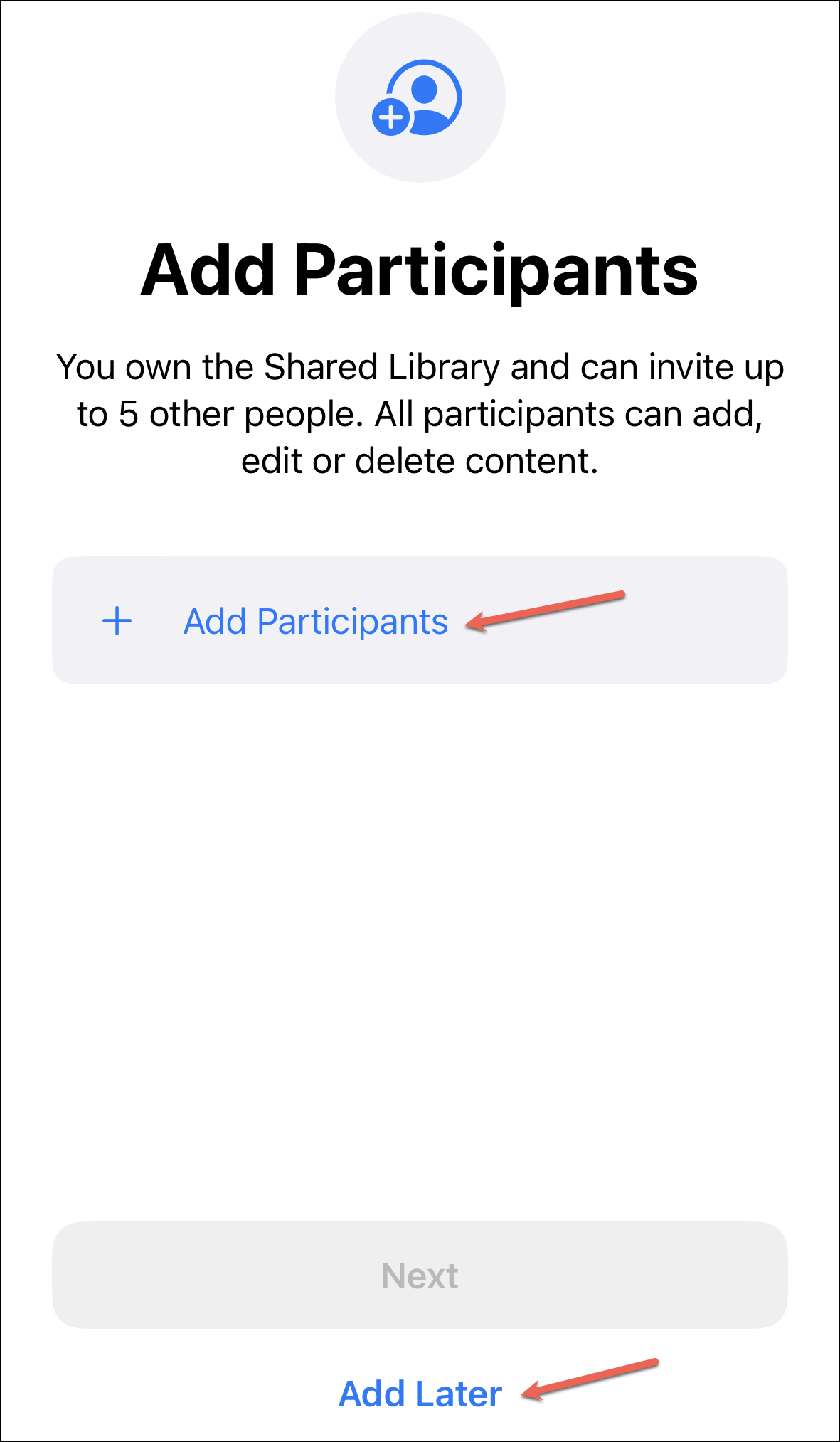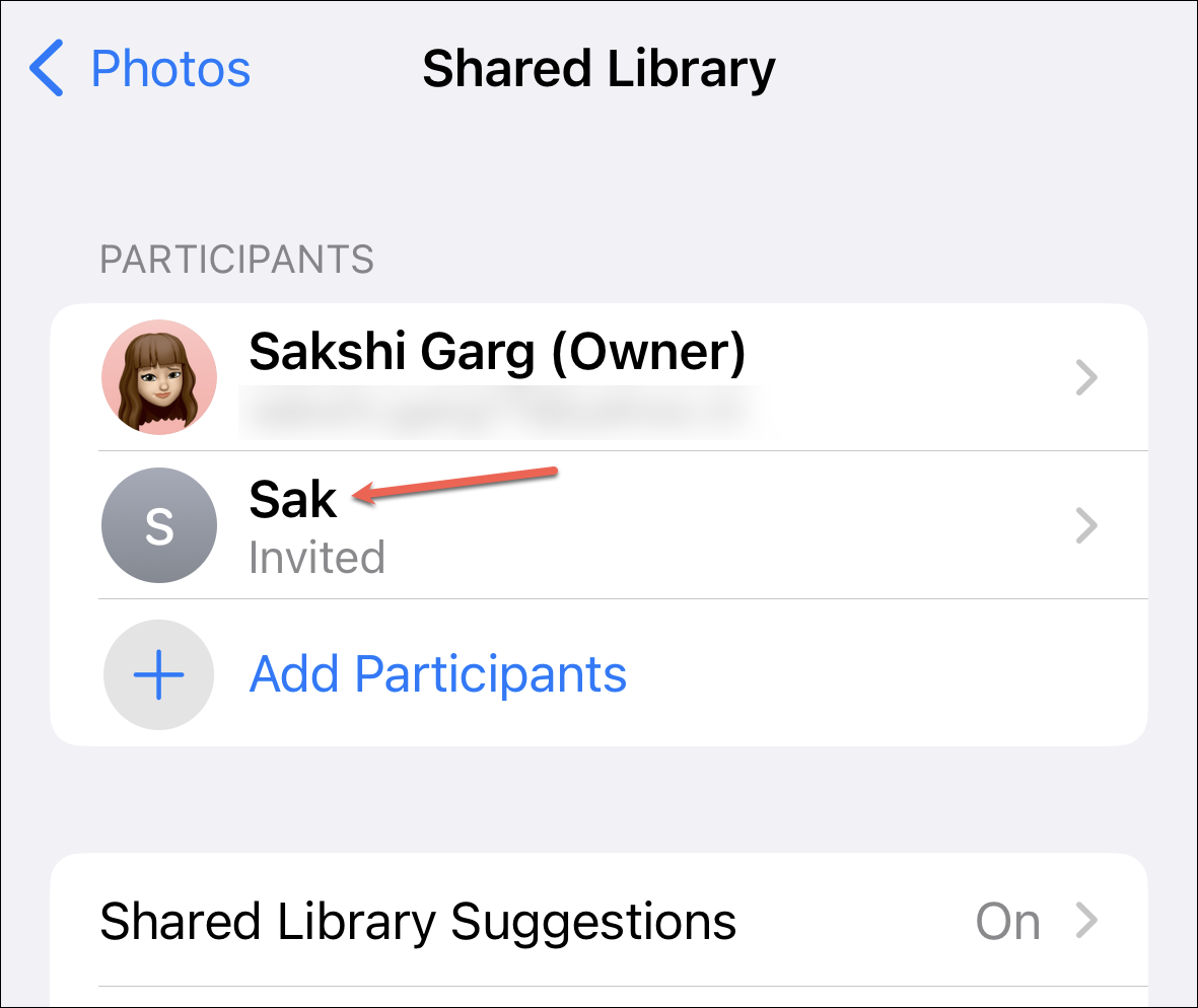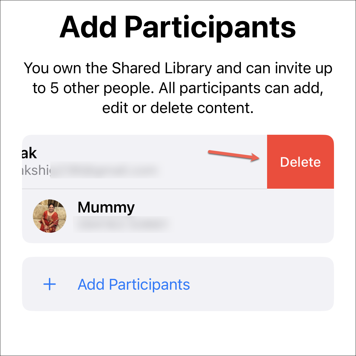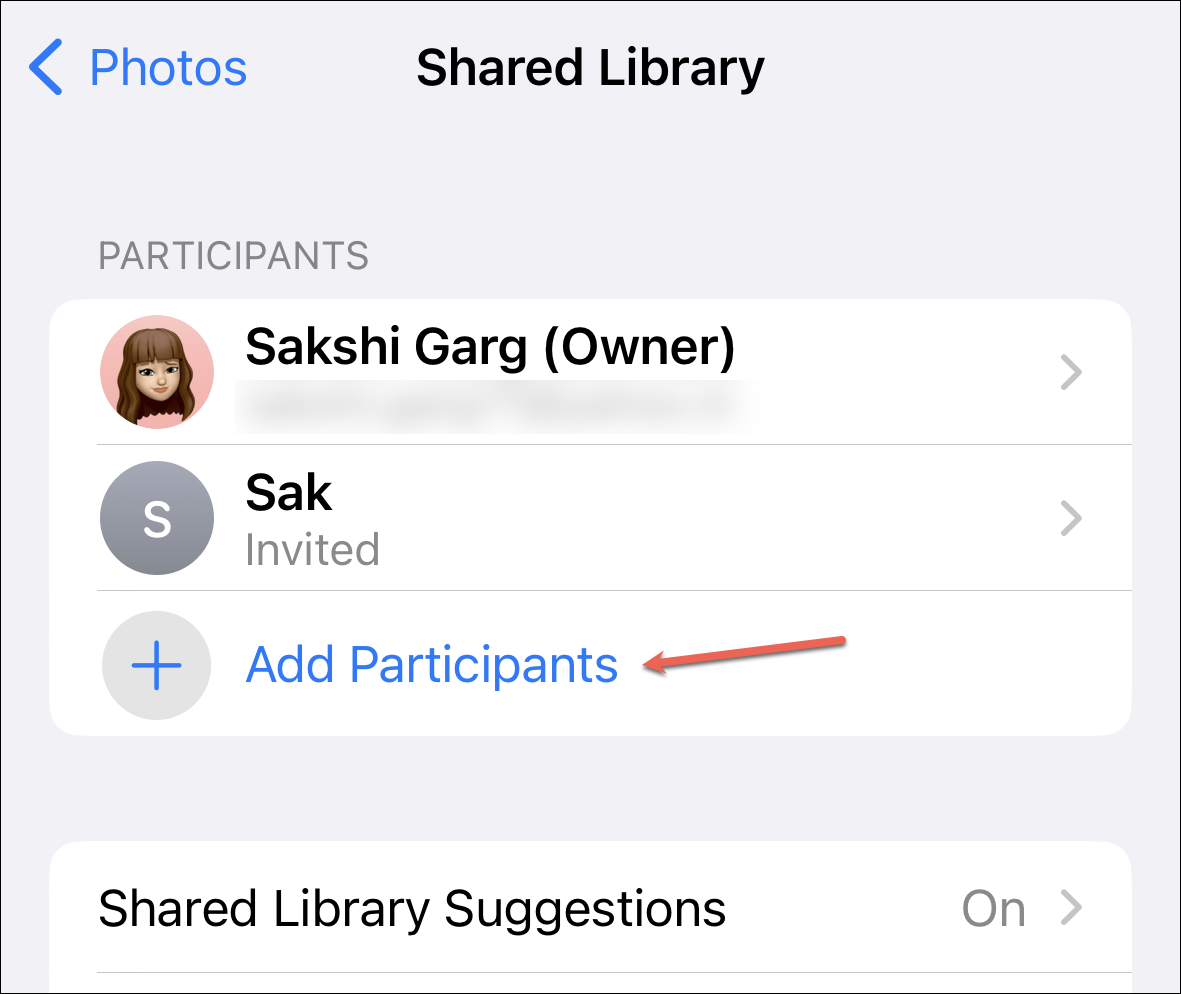 To invite another participant, go back to the Shared Library option in the settings. Then, tap ‘Add Participants’.