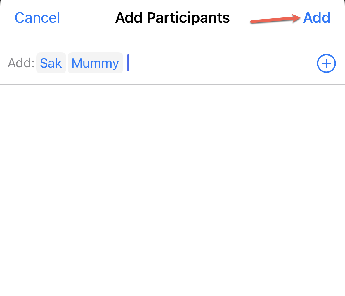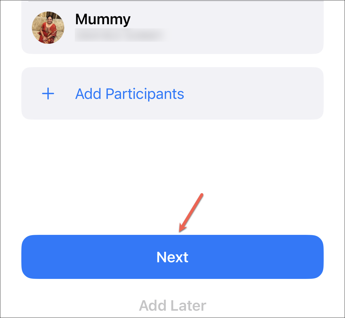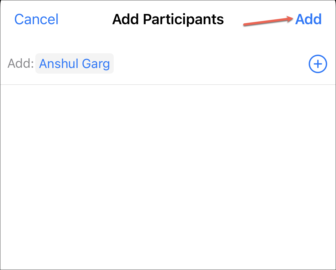If you chose to add a participant, type their Apple ID or phone number on the next screen. Then, tap their address from the suggestions. After adding all the participants, tap ‘Add’ in the upper-right corner.