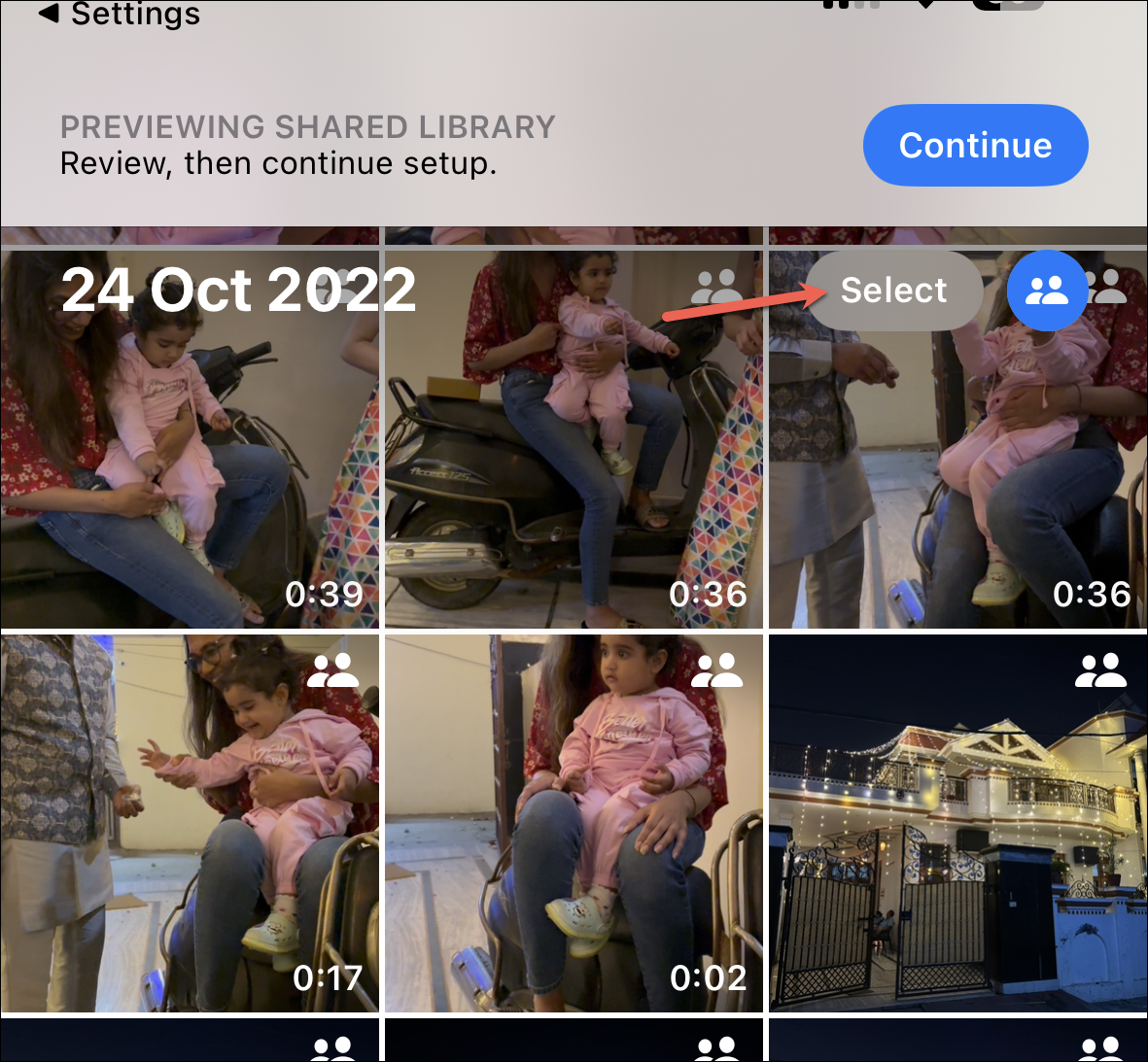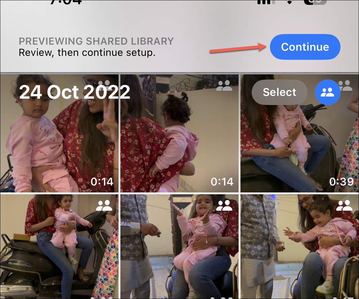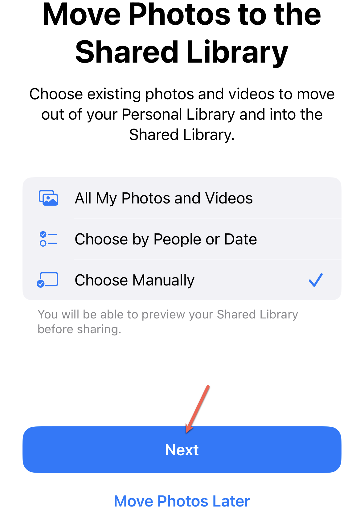 Tap the option you want to move forward with to select it and tap ‘Next’ at the bottom. You can also skip this step altogether and tap ‘Move photos later’ to deal with it later. No matter which option you chose, you’ll be able to preview your shared library before the setup is complete.